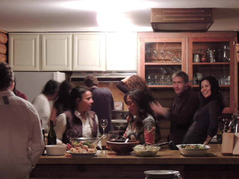 総勢16人が集まって、まずはおつまみを囲んでキッチンで飲み物片手におしゃべり。気がつくともう9時を過ぎています。ジェフがディナーのスタートの動きをみせるのを待っていましたが、おしゃべりに忙しそうだったので、リックに目配せしてお皿を並べ始めると、やっとディナースタートの流れに。