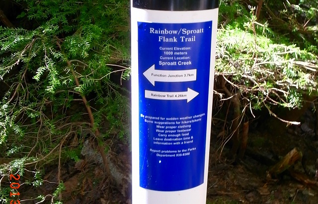 2時20分ごろ、やっと急坂が少なくなってきました。標識によると、標高1000m、Function から3.7㎞、Rainbow まで4.26㎞となっています。とりあえず、登り坂の多い3.7㎞をクリアしたようです。 かなり登ったので見晴らしがよくなりましたが、見えるのは隣の地区 Spring Creek 、距離はあまり稼いでいないようです。