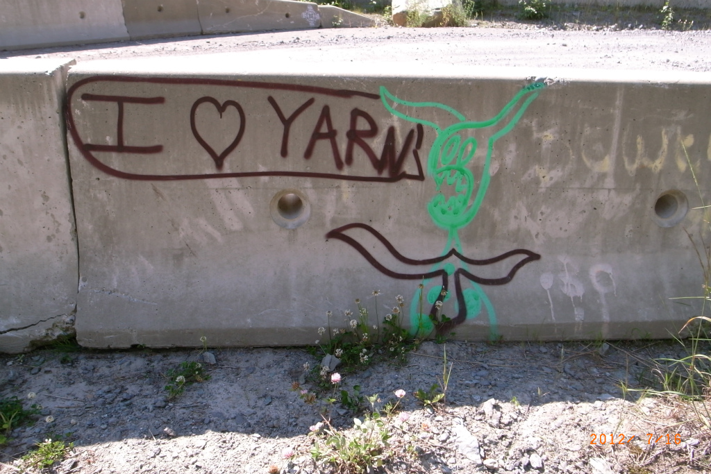 I ♥ YARN(毛糸大好き!)近くにこんな落書きがありました。どうやら編み物好きの人のようです。