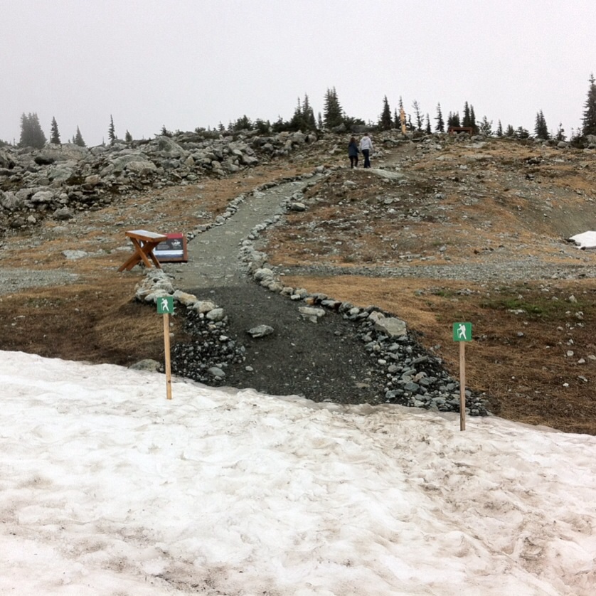 山のうえにはまだ雪が残っています。ブラッコム山の夏スキーがオープンしているので、ときどきスキーヤーやボーダーが滑って降りてきます。ハイカーはこの雪を横切って先のトレイルに進みます。なんだか変なかんじ(笑)
