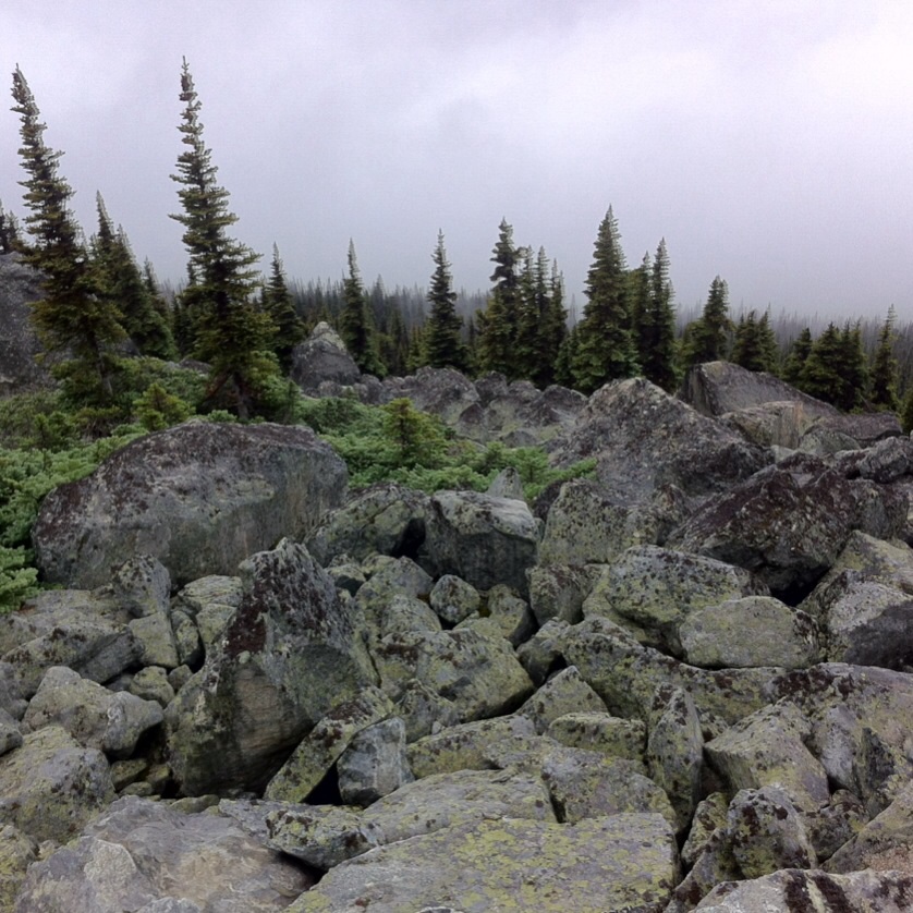 ブラッコムの山上は大きな岩がごろごろ。雲の上にいるせいか、雨はやんでいました。