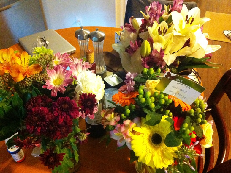 たった2泊の入院なのに、バンクーバーの友達と、いとこのリンがお花を持ってお見舞いに来てくれました。さらに自宅に帰ると、会社から花束が届きました。本当にありがたいことです。