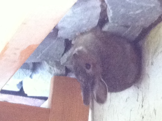 ある日、買い物から戻って、買い物袋を車から家に運びこみ終えたところで、ドアのベンチの下に丸い灰色のものがあるのに気づきました。スーパーの袋に入れたゴミかなにかを置き忘れていた?と思って良く見てみると、じつは灰色の小さなうさぎでした。急いで、ケイタイを取りに行ってもどるとまだそこに居ます。怪我でもしているのかと心配していましたが、私の隙をついて、ピョンピョン跳ねて逃げていきました。元気で良かった。私たちが帰ってきたので、慌ててベンチの下に隠れたのでしょう。。。