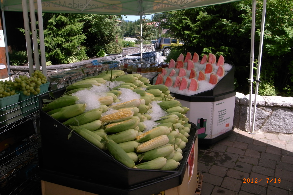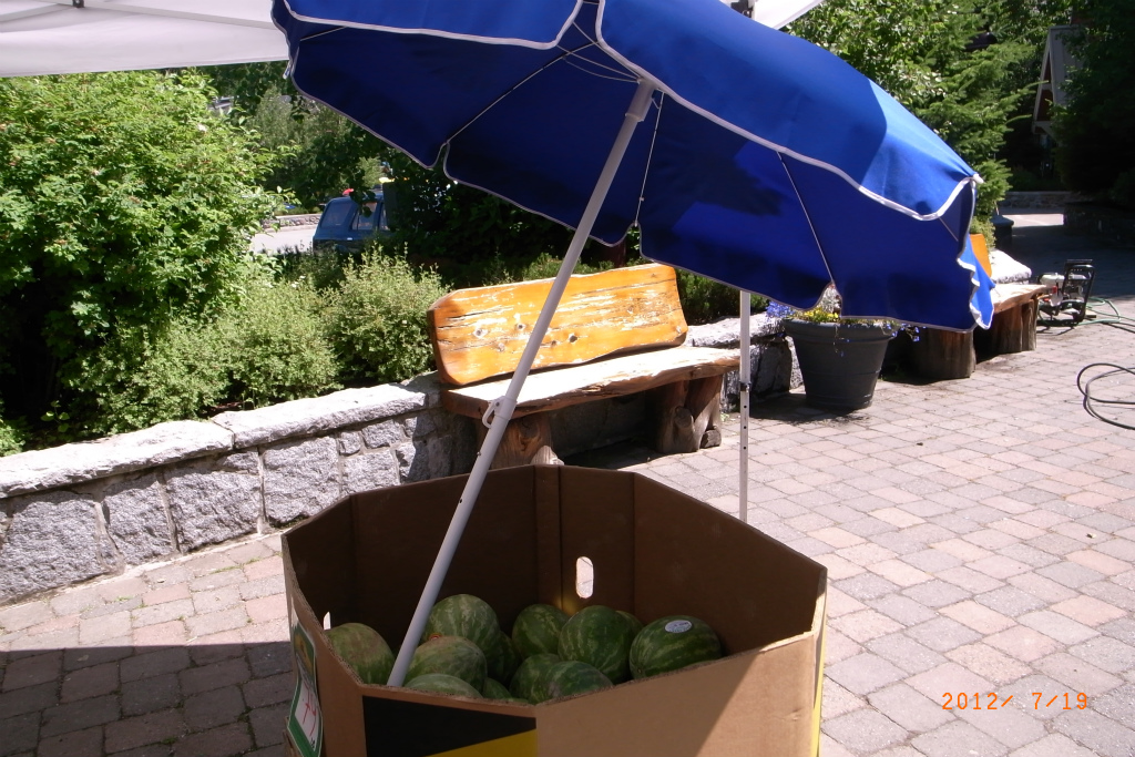 カットしたスイカは氷の上にならんでいます。暑い日だったのでトウモロコシにも氷がかけてありました。
