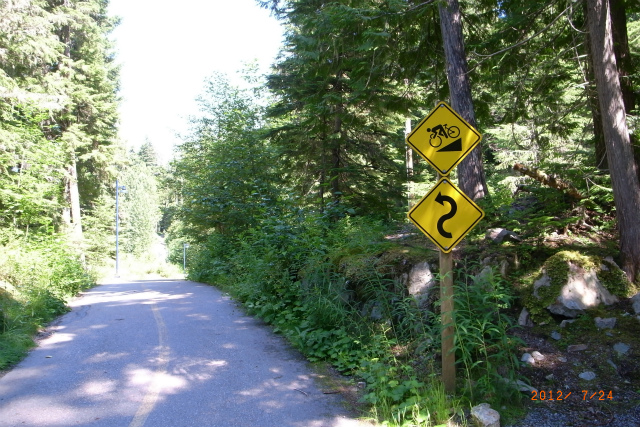 舗装された歩行者・自転車専用のValley Traiを通って30分足らずで行けます。これはカーブのある少し急な下り坂の標識。舗装されてはいますが、アップダウンがあるので何カ所か息切れスポットありです。