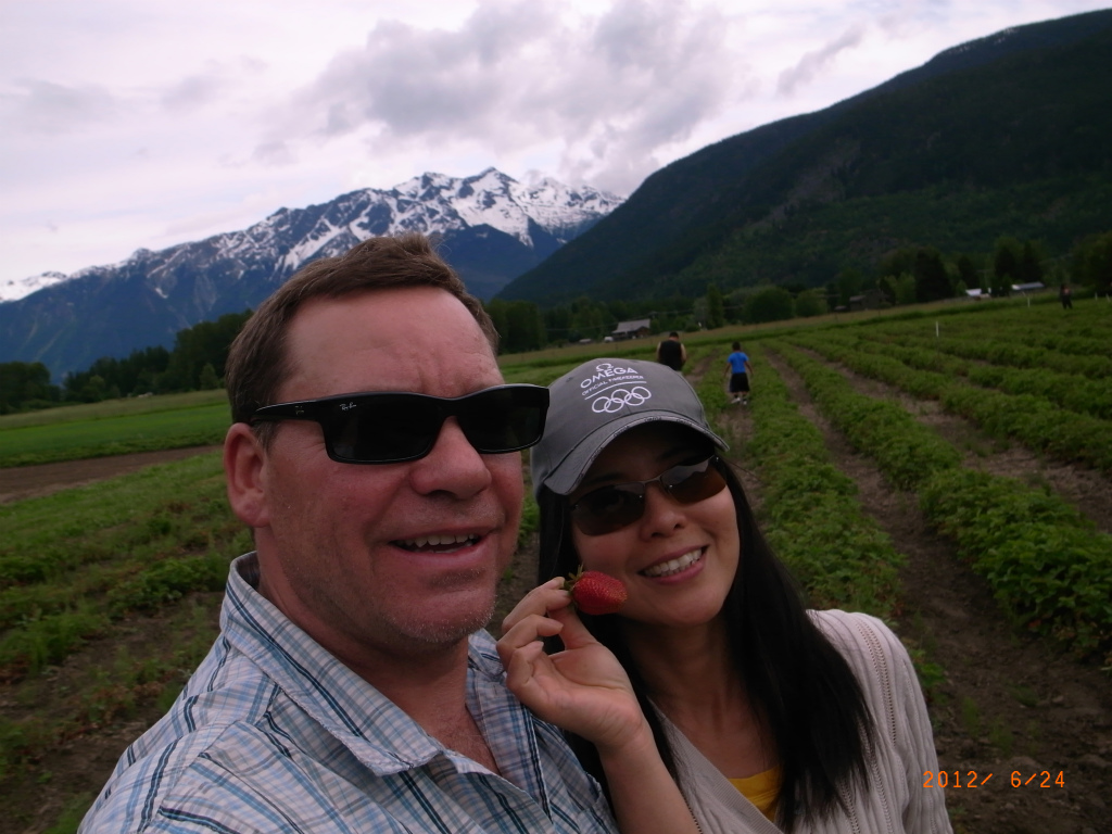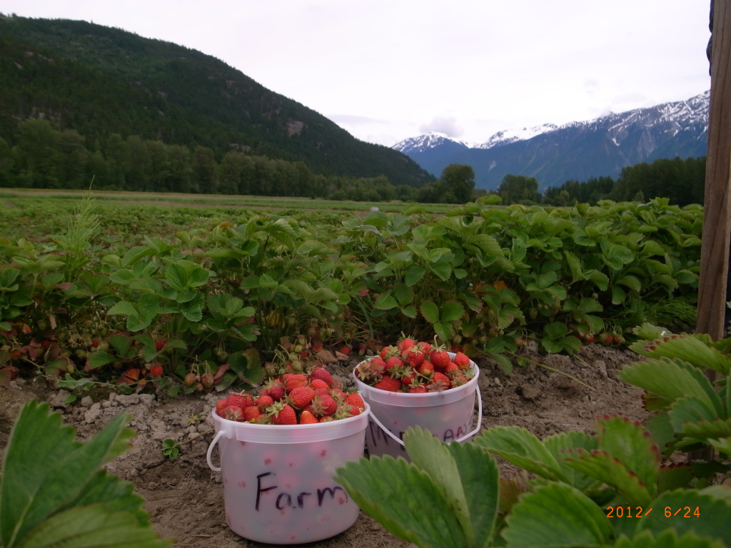2012年6月23日(土)くもり 土曜日にペンバートンへ産直の野菜を買いに行こうとでかけました。Information centre に寄って、野菜を売っている農場の場所を聞いたとき、別の場所でイチゴ狩りがちょうどその日にオープンしたと教えてくれたので、野菜を買ったあとで、行ってみました。ペンバートンは車で30分ほどのところにありますが、標高が低いせいか、ウィスラーより気温はずっと高めです。この日も汗ばむ陽気、おかげでイチゴもたわわに実っていました。地元の人も来ていて、聞いてみるとたくさん採ったイチゴは冷凍しておくといいとのこと。私も教えてもらったとおり、ワックスペーパーの上にひとつひとつ並べて凍らせてから、袋にうつしました。こうしておくと、確かに使いやすくて便利です。いちごシェイクや、ストロベリー・マルガリータにして楽しみます。