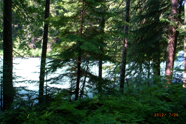 しばらく行くと、湖から川への注ぎ口が見えますが、木が茂っているので水際には近づけません。
