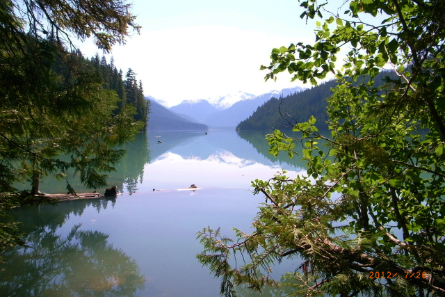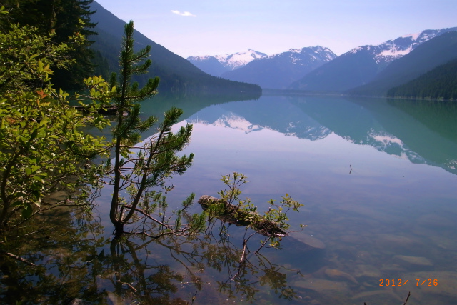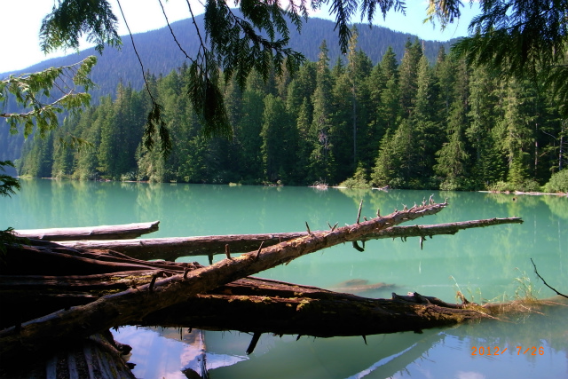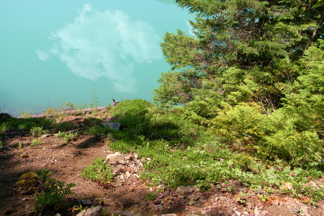雪解け水が流れ込む湖で、明るいエメラルドグリーンです。