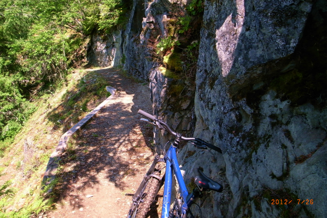 山側は岩が張り出していて、ハンドルがぶつかりそうです。ちょっとバランスを崩すだけで湖に真っ逆さまなんてことになりそうなので、ここで引き返すことにしました。