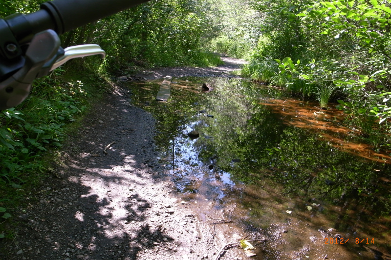 大きな水たまりが数カ所あります。私は水たまりのたびにスピードを落としてそーっと水の中を走り抜けますが、陸はスピードを落とすことなく走り抜けるので足やバイクショーツは泥はねだらけ。