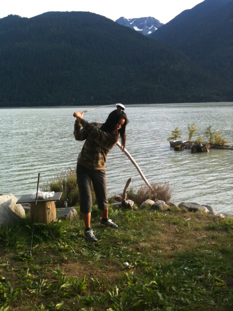 ジョディがギターを持ってきて、いま練習してる曲、聞いてー!と弾き語りを始めました。少しつまりつつも、いい音色でギターをかなで上手に歌います。 でも陸はもっとボールを打ちたくて、うずうずしています(笑) 歌い終えたあと、ジョディたちはキャビンに戻ったので二人で残りのボールを打ちます。陸はけっこう飛ばしますが10年以上クラブを握っていない私はなかなか飛びません。陸は教えるのも大好き、こうして、ああしてと一所懸命ご指導してくれます(笑) 8時頃、ジョディたちにさよならしてキャビンに戻りサウナを楽しんでから眠りにつきました。キャビンは静かでよく眠れます。