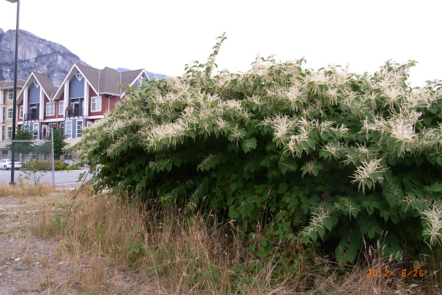 先月、ブラックベリー狩りをした Squamish の空き地にも Japanese Knotweed が生えていました。私の身長をはるかに越えています。こんな大きな植物、日本ではあまり見かけないような、と思われるかもしれませんが、実は日本でもそこらじゅうに生えている植物です。ただし、日本ではこんなに大きくならないようです。これはタデ科の植物、イタドリ、スカンポなどと呼ばれる植物で、もともと、観賞用として輸入されたそうですが、なぜかこちらでは異常な繁殖力を持ち、家を壊すほどの勢いで伸びるそうです。イギリスでも問題になっていて、敷地内にこの植物が生えていると家の損害保険に入れないとか。下手に草刈り機などで刈ると一気にあたりに広がるそうで、根っこから掘り起こしても、ほんの少し残った細い根から芽をだすとか。そこで、根っこに除草剤を注入する方法で駆除を行ってるそうです。