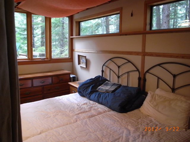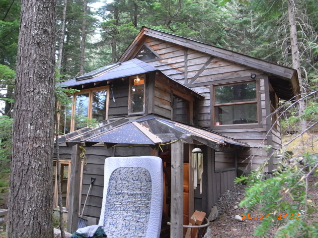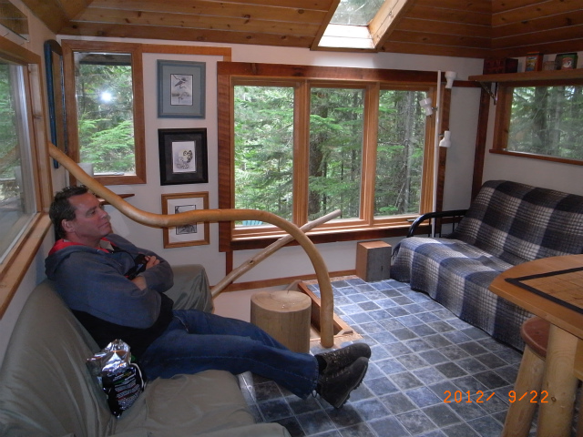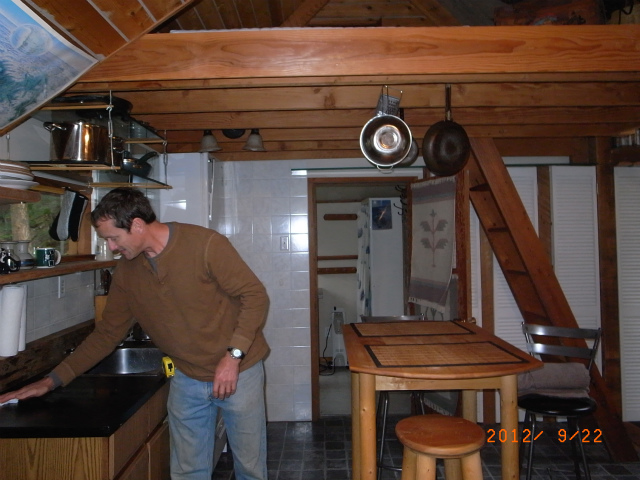 ジェフはまだ片付けを続けます。後ろのはしごを上がるとロフトがベッドルームになっています。冬の間、バンクーバーから週末ごとにスキーをしにウィスラーに来る人に、キャビンを貸す予定です。