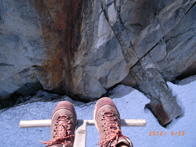 岩と雪の間に深い溝があって、見下ろすとドキドキ。
