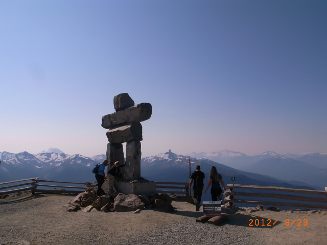 リフトを下りるとウィスラーの山頂です。ここにある、イヌクシュクは2010年冬のオリンピックのシンボルでした。これは、もともと北極圏で暮らすエスキモー、こちらではイヌイットと呼ばれる人たちが道しるべや猟場の印として石を積み上げて目印として使ったものだそうです。イヌクシュクの右手の二人連れが歩いているところがハイキングトレイルの入り口です。