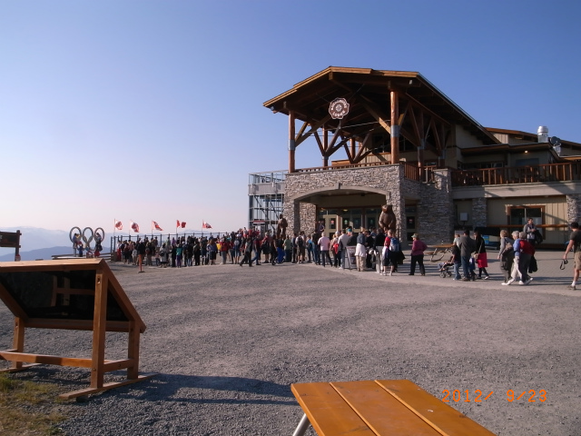 5時半にゴンドラが終了するので、後半は時間を気にしながら歩きましたが、無事時間内に乗り場に到着しました。なんと再び長蛇の列! ほとんどの人は長いハイキングではなくゴンドラ乗り場の周辺を軽く歩いて写真を撮り、ウィスラーマウンテンとブラッコムマウンテンをつなぐ Peak to Peak と呼ばれるロープウェイに乗って景色を楽しんでからゴンドラに戻って山を下りる観光客の人たちです。