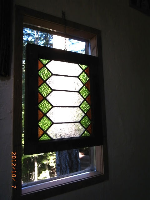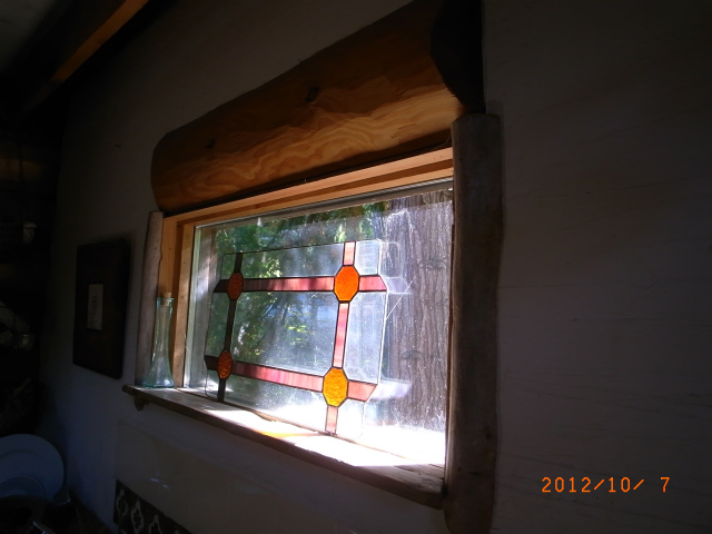 キッチンのシンクの上の窓にもステンドグラスが飾ってあります。上にはログが渡してあります。