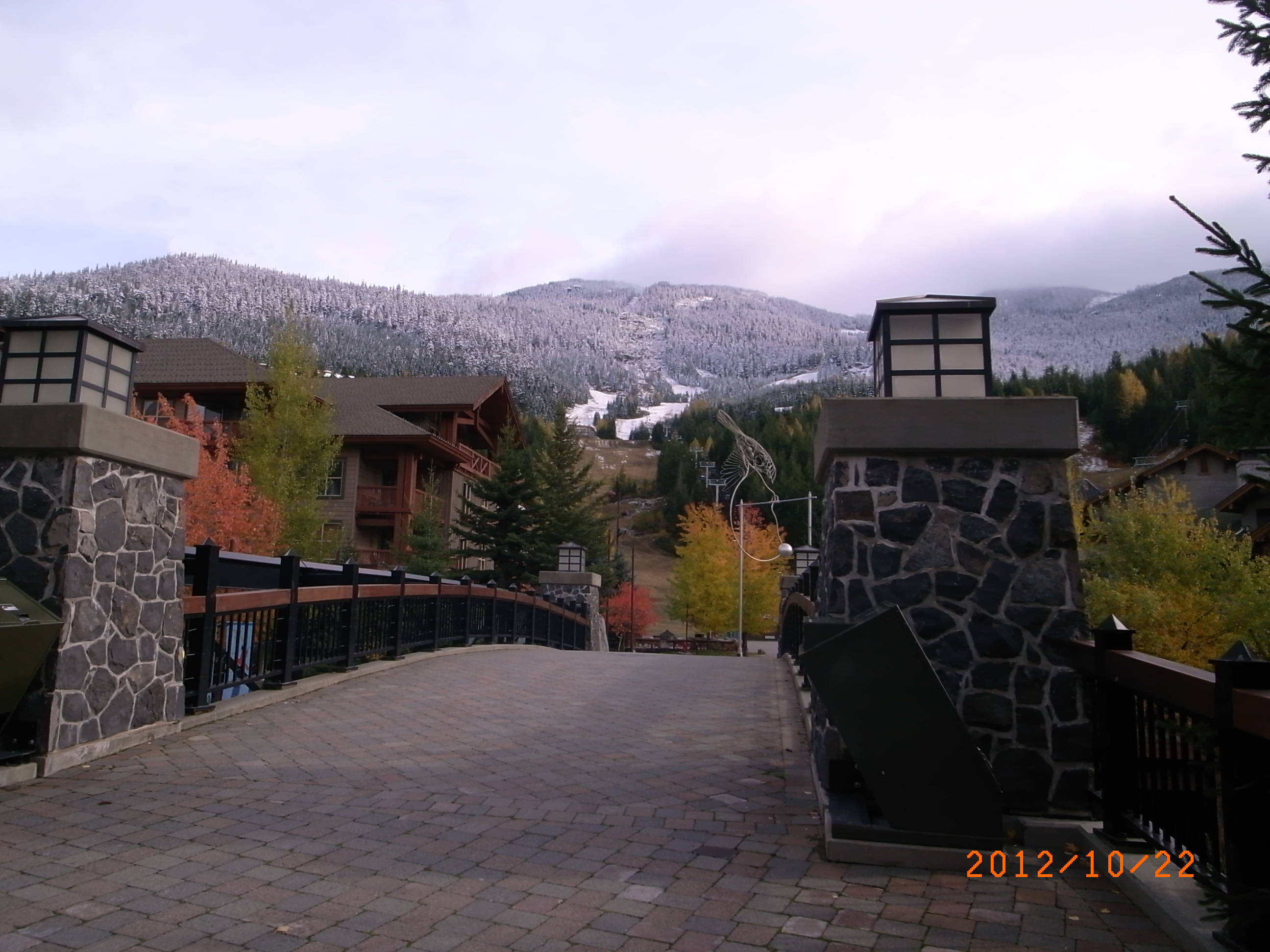 陸の誕生日の2日前に陸の妹から、ぎりぎりなんだけど陸にギフトバスケットを贈りたいから、どこかおすすめの店があったら教えてとメールがきました。ギフトバスケットはプレゼント用にチーズやクラッカー、フルーツなどをカゴに詰めて配達してくれるサービスのようです。そんな物の存在をほとんど知らなかった私にオススメの店などある筈がありません。ググってみるといくつか見つかりましたが、陸はそういうファンシーなものを喜ぶタイプではありません。 じつは、私たちが婚約したとき、陸のお母さんがジェフに電話して、フルーツバスケットを贈りたいけど手配してくれないかと頼みました。ジェフも陸と同じタイプ。店が作るフルーツバスケットなんて割高でもったいないと言って、家から大きなバスケットを持って来て、陸を連れてグロッサリーストアに出かけ、陸に好きな物を買わせて、カゴに詰めてフルーツバスケットにしました。 そこで、「陸はギフトバスケットなんてもったいないだけというタイプ。赤ワインが大好きだから、よかったらリカーストアでよさそうなワインを買ってくるけど、どう?」と返信しました。この提案に賛成のメールが届いたので、ワインを買いに出かけることに。さいわい曇り空ですが雨も雪も降っていません。久しぶりにバイクでリカーストアのあるクリークサイドまで出かけました。気温は3度前後でしたが、いったんバイクをこぎはじめるとそれほど寒く感じません。 スキー場の途中まで雪が後退していました。山の上では、人工雪作りが始まっているそうです。 クリークサイドのリカーストアは少しわかりにくい場所にあるので、看板が出ていました。BC州では、ほとんどの酒屋は州営の BC LIQUER Store です。スーパーやコンビニではアルコールは買えません。州営の店のほかに、許可をうけた民営の Cold beer and wine store などと呼ばれる酒屋がありますが、ほんの少し値段が高いそう。ただし、こちらでは店の名前のとおり、冷えたビールが買えます。 紅葉した木の向こう側が入り口です。 イタリアワインと、スペインワインと指定して、店員さんのオススメを買いました。帰ってからギフトバスケット風にしてみました。