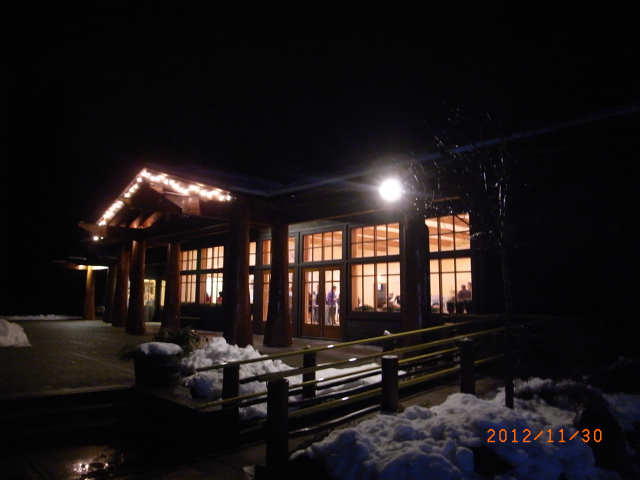 立食パーティだと思っていたら、テーブル席も用意されたディナーパーティでした。7時スタートで最初の一時間半ほどは、飲み物片手に前菜をつまみながら歓談します。お寿司や、スペアリブ、エビのソテーなどなど、どれもとても美味しく、上質な料理でした。日本人のカップルがいたので話を聞いてみると、ご主人は夏はカーペンター、冬はヘリスキーのガイドをされていて、こちらに住んで12年ほどとか。お子さんは一人、小学校2年生のケンタくん。奥さんと話していると、マーティのパーティで会った、教師のドンがやってきました。ドンはケンタくんの担任の先生だったとか。そして、ドンはマーティとリンも来る予定だから、テーブルの席を確保して一緒に座ろうと言います。どうして、マーティとリンもこのパーティに!?と不思議に思っていたら、インテリア・デザイナーのリンが、この会社からも仕事を受けているそうで招待されたとか。小さな町なので、いろんなところでいろんな人が繋がっています。