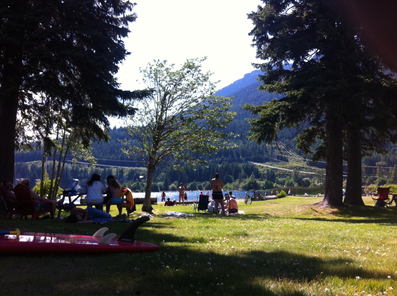 日暮れ近くなってから、やっと風が出てきたというので、男性陣はセールボートでまた湖に出て行きました。その後みんなで食事にでかけ帰ったら11時過ぎ。典型的な夏のウィスラーの週末でした。こちらの人は、遊ぶときは徹底的に遊ぶのでたいへんです。すっかり遊び疲れて、この夜はぐっすり眠りました(笑)。