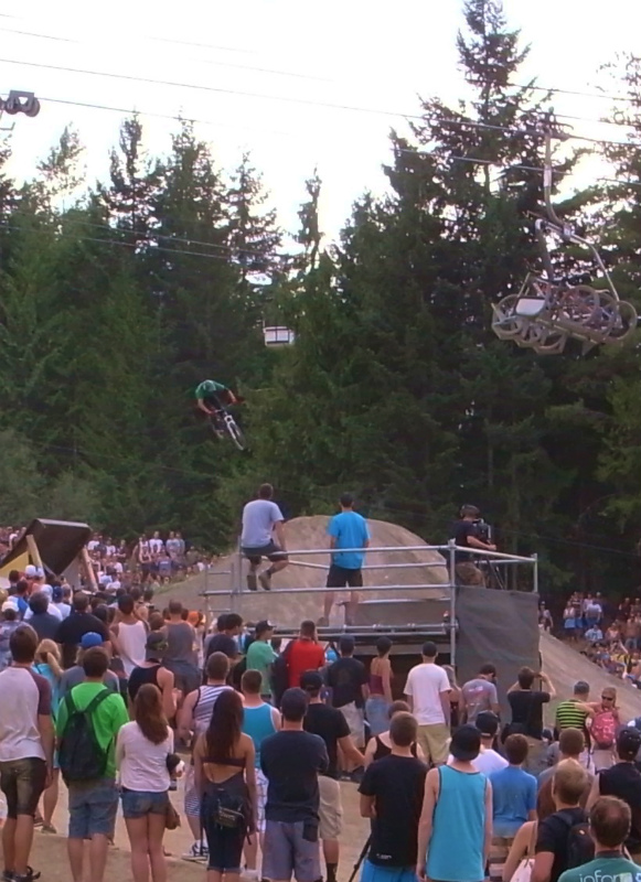 ダウンヒル競技の選手たちとは違い、この種目の選手たちは軽装なのが気になります。下半身はプロテクターを付けているようでしたが、上半身はTシャツ、エルボーパットすら付けていない選手もいて、見ていてハラハラしました。案の定、エルボーパットなしの選手がバランスを崩して肩から着地して腕や肩を大きく擦りむいていました。痛そう〜! ジャンプの後の着地で転倒する選手は多く、手に汗握る競技です。