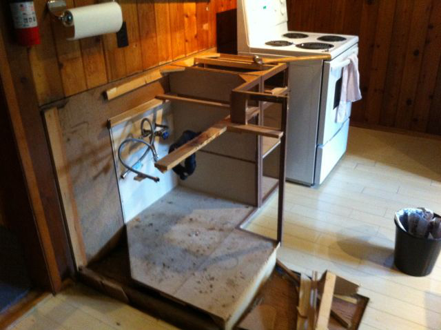 キャビネットを取り払ったあと、壁も全部はがしました。この機会にと、リックの友達のプラマーに来てもらって配管をやりなおして古い銅のパイプの一部を新しいパイプに変えてて貰いました。